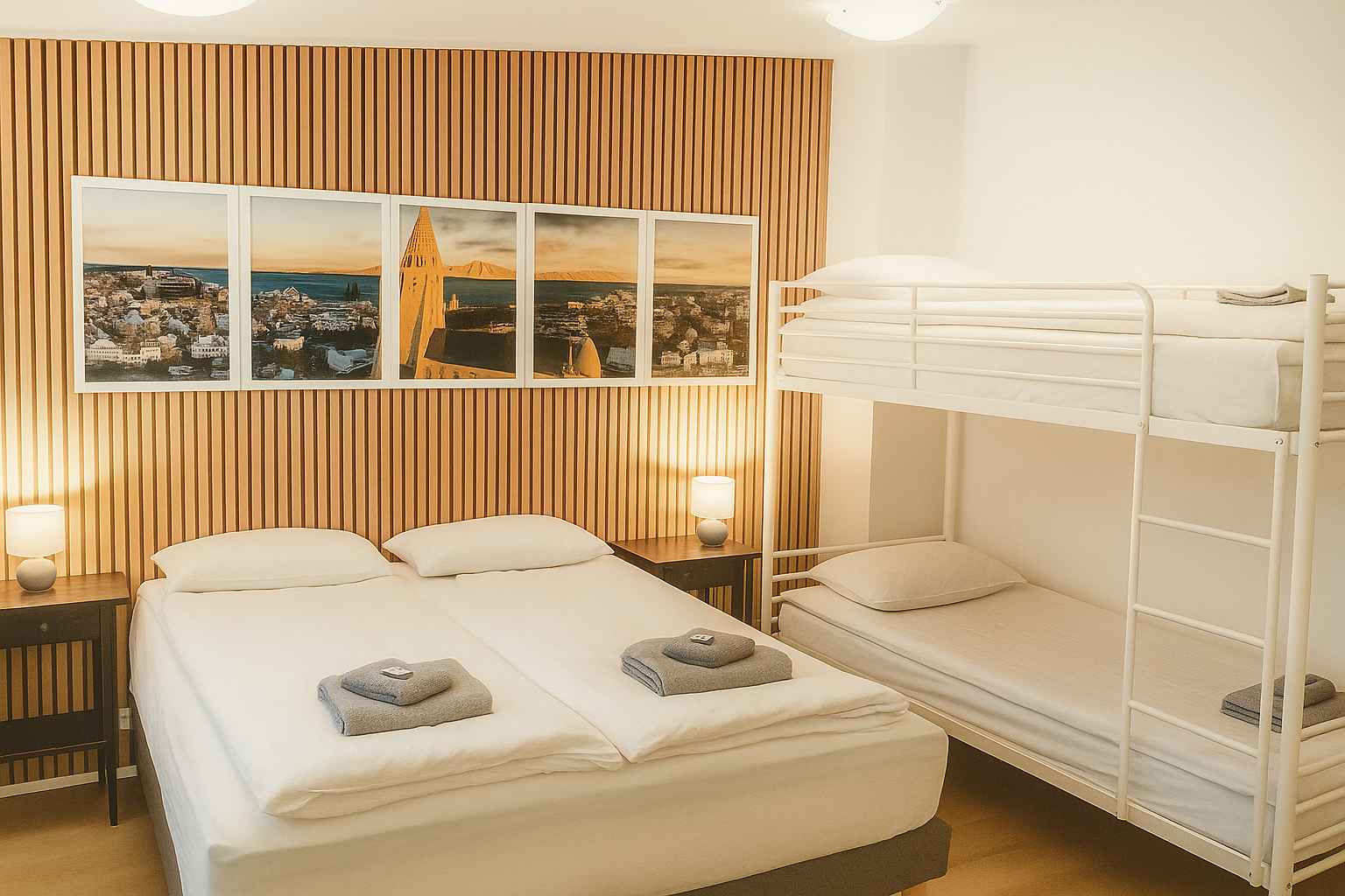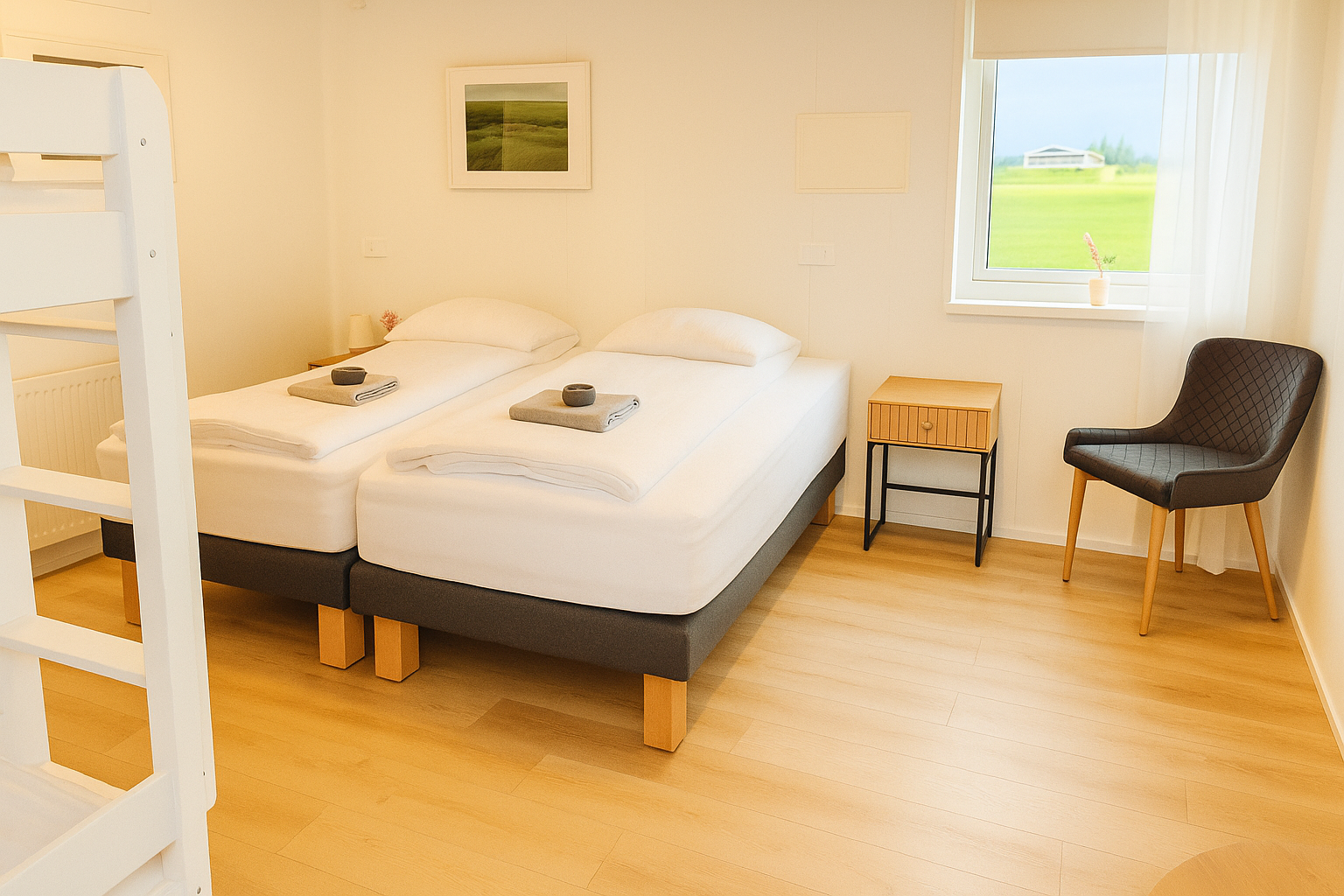 Perfect for families and small groups, our Family Rooms at Hvítá Inn offer plenty of space to unwind after a day of exploring West Iceland. Each room features one comfortable double bed and two cozy bunk beds, making it an ideal choice for parents traveling with children or friends sharing a stay.