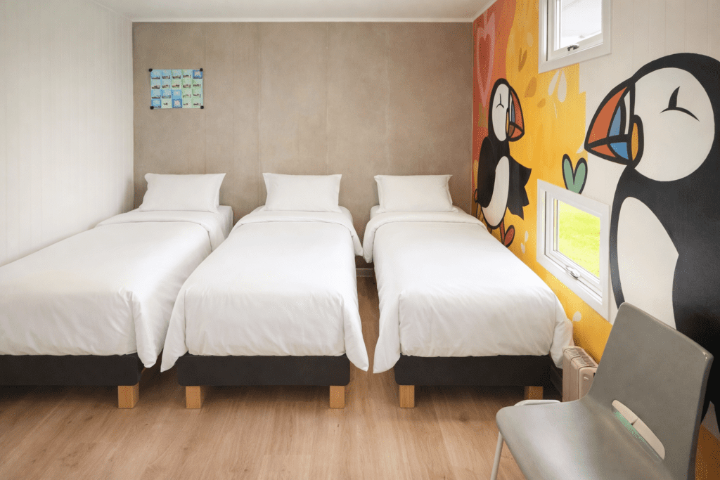 A fun and compact triple room inside a restored army truck, featuring three single beds, a private bathroom, and playful Icelandic design. Breakfast is included next door at Hvítá Inn.